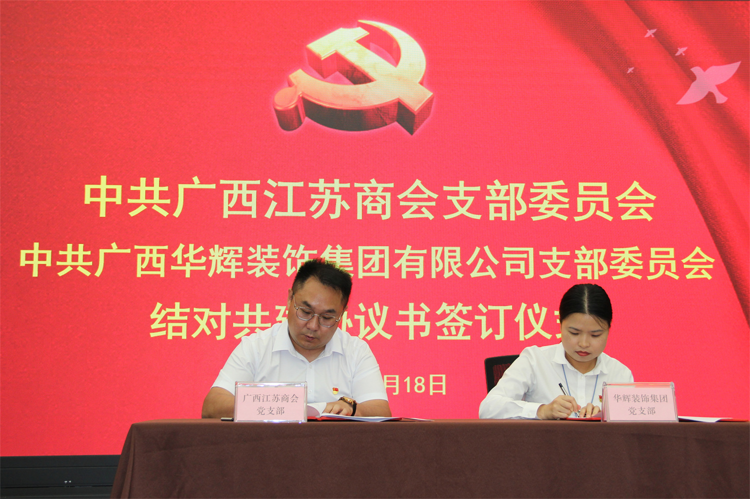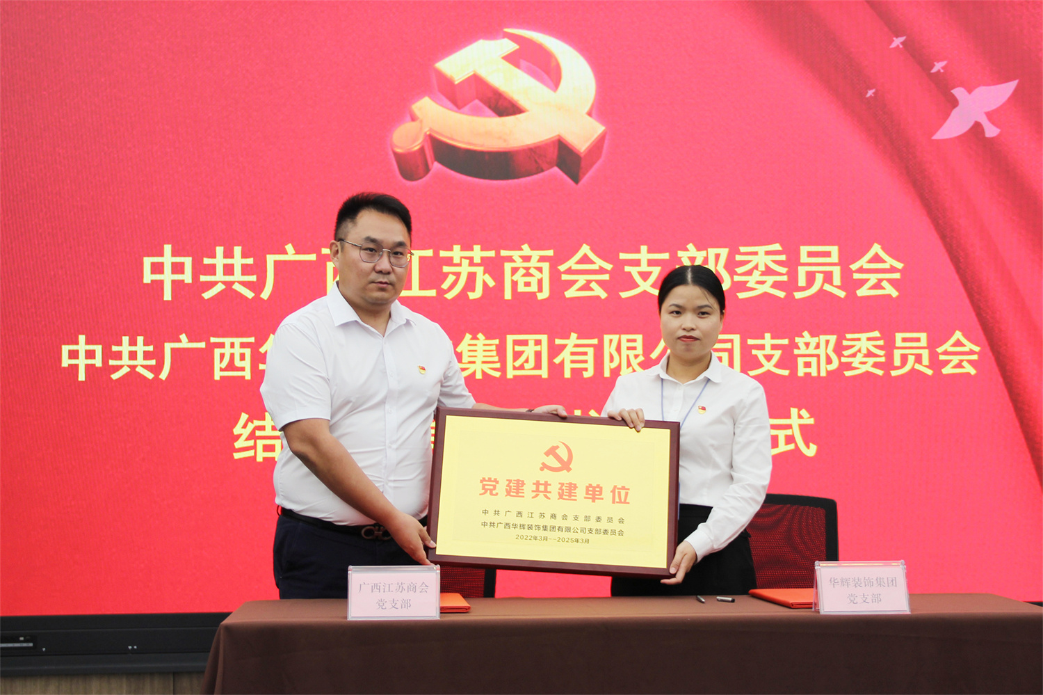 签约仪式上,商会党支部书记王伟、bsports必一体育装饰集团党支部书记刘萍东签订了结对共建协议,并由王伟同志代表广西江苏商会党支部向广西bsports必一体育装饰集团有限公司党支部赠牌。