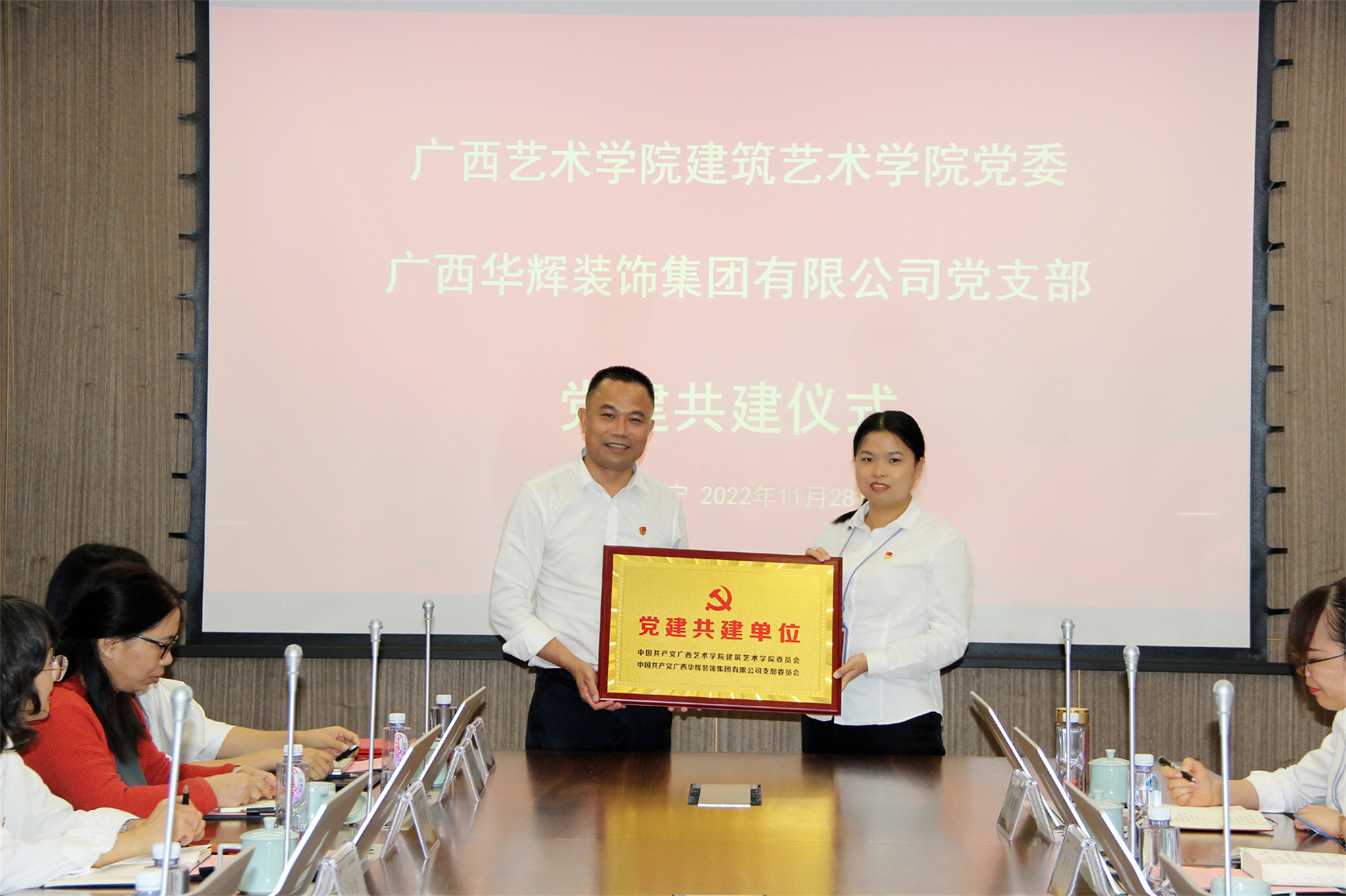 随后,广西艺术学院建筑艺术学院党委书记冯凤举、bsports必一体育装饰集团党支部书记刘萍东签订了结对共建协议,并由冯凤举同志代表广西艺术学院建筑艺术学院党委向广西bsports必一体育装饰集团有限公司党支部赠牌。