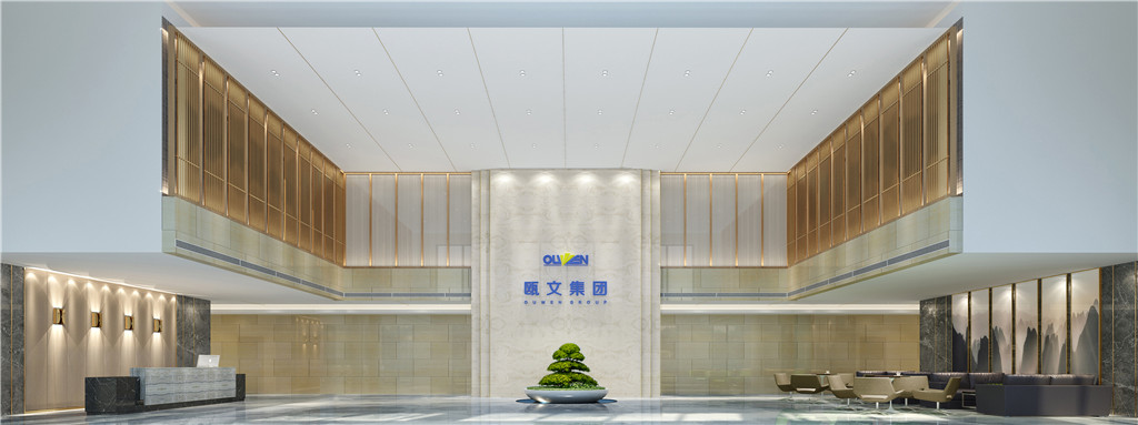 取水之蓝、家之皇为元素,以木饰面、陶瓷、大理石为载体,应用于墙面、地面、主背景墙。体现了欧文集团厚德载物,开放包容,儒雅热情迎八方来客的气魄。
