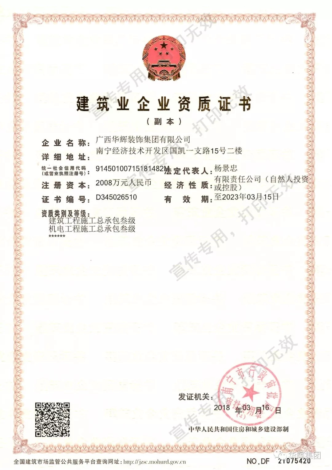 近日,在集团全体员工的团结协作、共同努力下,bsports必一体育装饰集团获得建筑工程施工总承包叁级资质、机电工程施工总承包叁级资质!