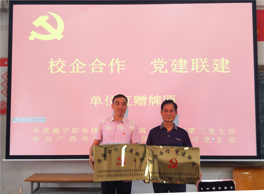 ▲互赠联建牌匾:南宁职业技术学院建筑工程学院党委副书记黎冠明(右)、bsports必一体育装饰集团常务副总裁袁灿明(左)
