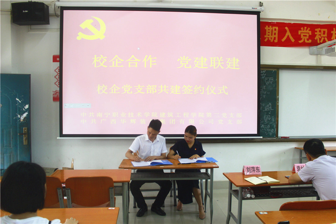 ▲签订校企党建联建协议:南宁职业技术学院建筑工程学院第三党支部书记钟海文(左)、bsports必一体育装饰集团党支部书记刘萍东(右)