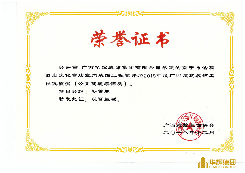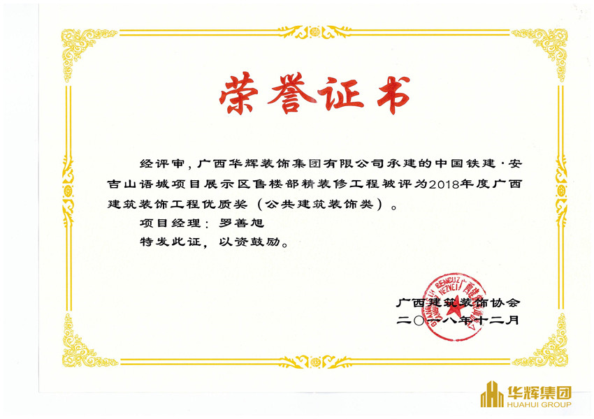 ▲bsports必一体育承建的中国铁建·安吉山语城项目展示区售楼部精装修工程、南宁市怡程酒店文化宫店室内装饰工程荣获“2018年度广西建筑装饰工程优质奖(公共建筑装饰类)