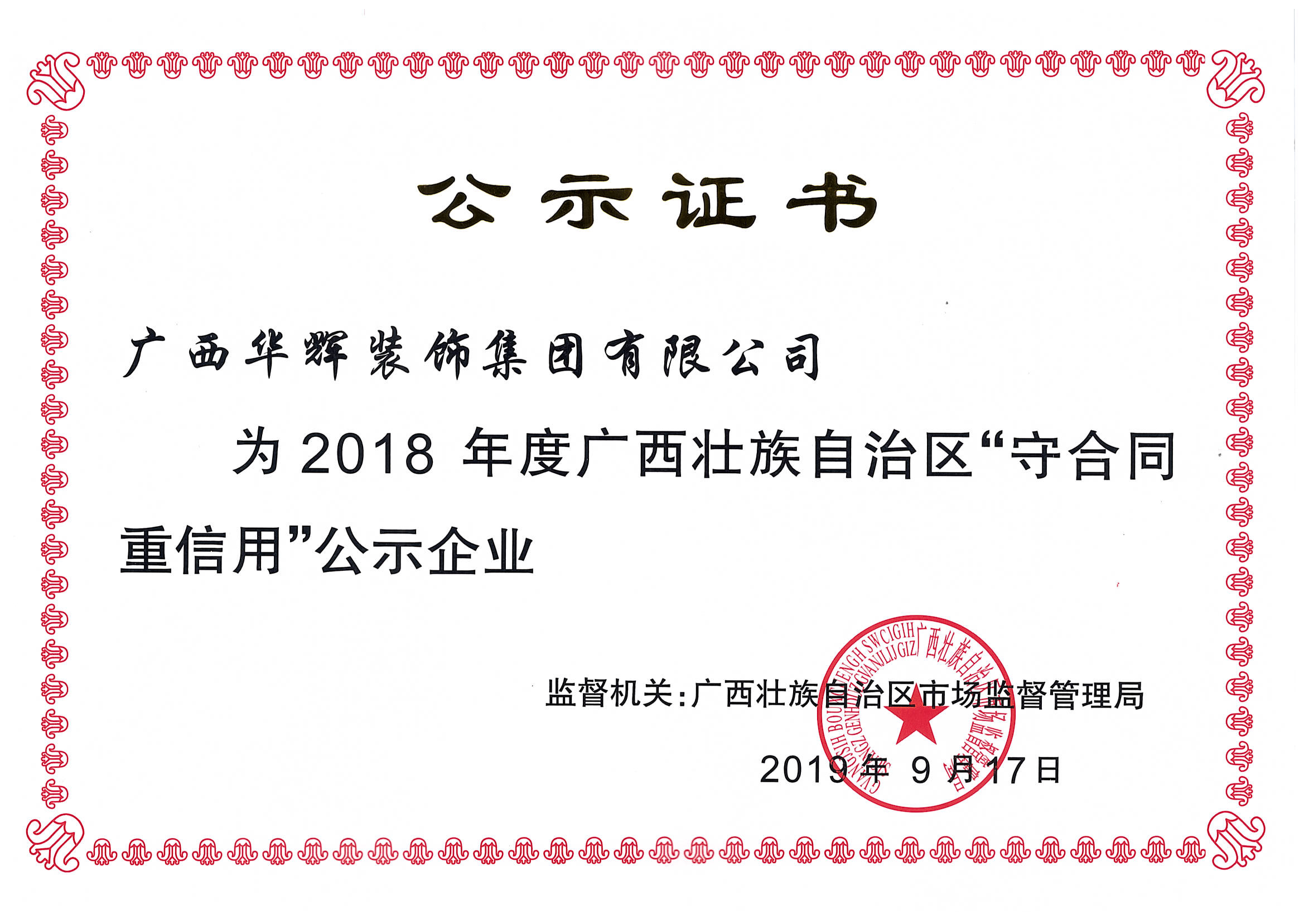 近日,在广西壮族自治区市场监督管理局开展的“守合同重信用”企业评选活动中,bsports必一体育凭借自身良好的信用体系建设、诚信守约形象,荣获2018年度广西壮族自治区“守合同重信用”企业。