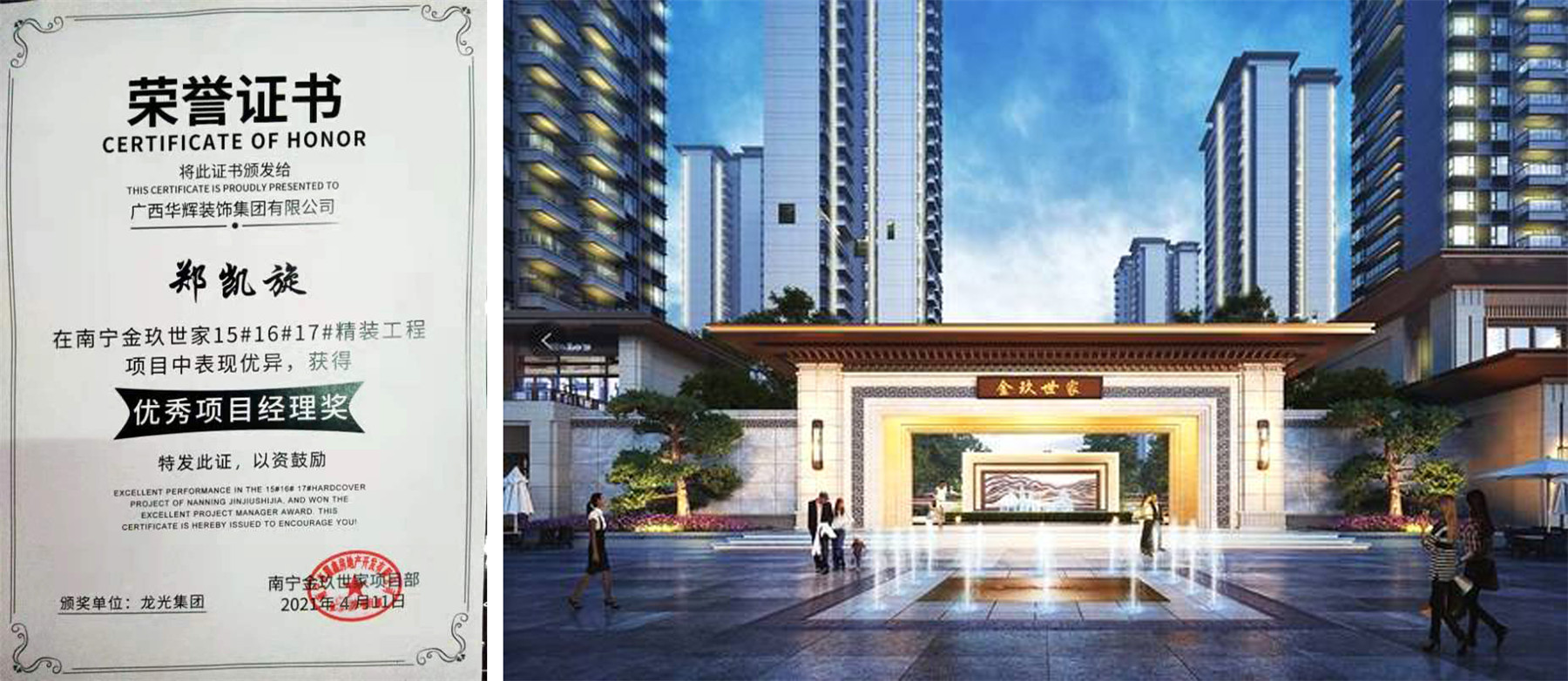 bsports必一体育承接的龙光金玖世家项目在工程质量、安全文明、工程进度等各方面表现优异,获得龙光集团颁发的“优秀项目经理”奖项。