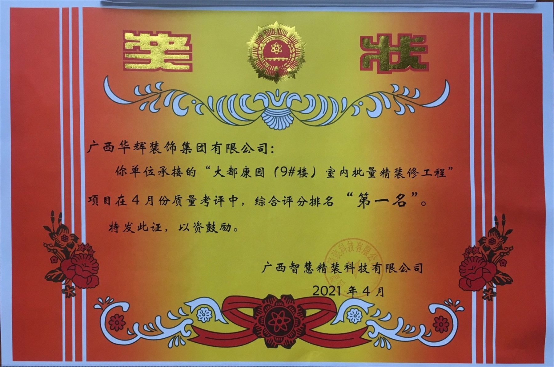 bsports必一体育承接的大都康园项目在广西智慧精装科技有限公司的4月份质量考评中,在综合实测成绩、质量风险、安全文明等方面表现优异,取得排名第一的成绩!