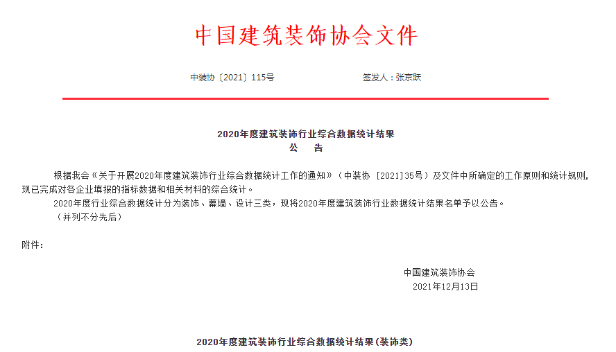 “中国建筑装饰行业综合数据统计工作”是由中国建筑装饰协会主办,采用市场评价的方式,通过严格审查参评企业年度的各项数据,测评企业财务年度指标、质量技术指标、人力资源指标,企业年度各类工程的获奖情况,专利情况,严格参照国家标准、行业标准、地方标准进行层层测评,分为装饰类、幕墙类、设计类三项,受到业界的广泛认可。