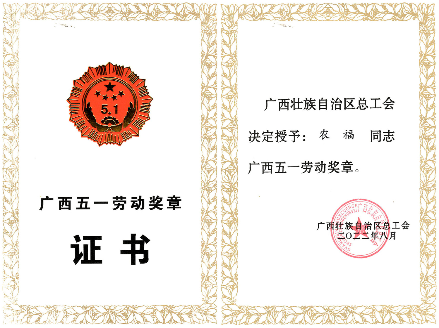 2022年8月25日,2021年度全区住房城乡建设系统劳动和技能竞赛总结表彰大会暨“红色工地”观摩会在中建三局一公司南宁中银金融中心项目举办,bsports必一体育集团农福同志荣获广西五一劳动奖章奖状。