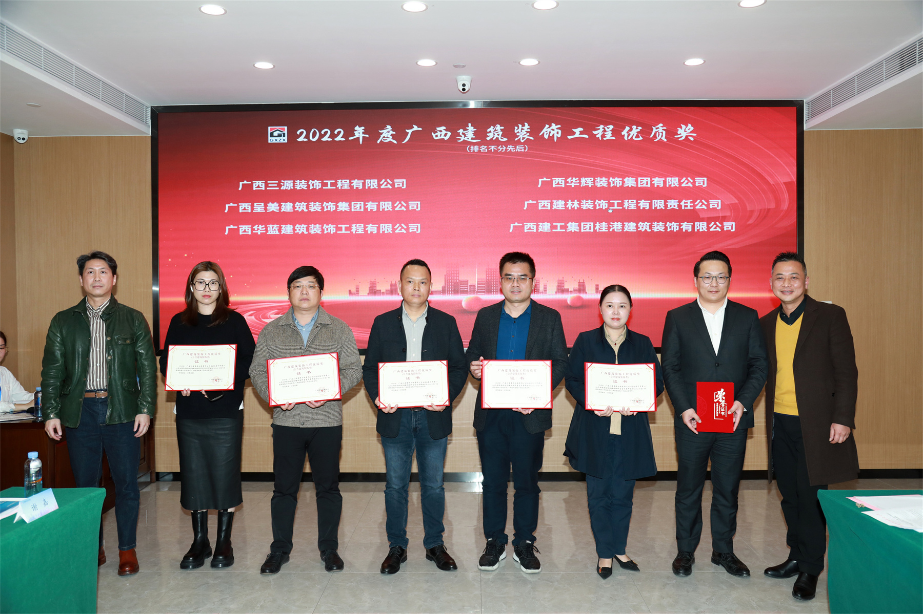 会议宣读并表彰了“2022年广西建筑装饰工程优质奖(广西建筑装饰工程最高质量奖)”获奖项目,bsports必一体育集团四个项目荣获表彰,分别为:广西社区养老示范中心装修工程设计施工总承包项目,金城广场一期工程,广西北部湾银行五象总部大厦非标准层装修项目,盛天西城希尔顿欢朋酒店客房、公共区域装饰装修工程。