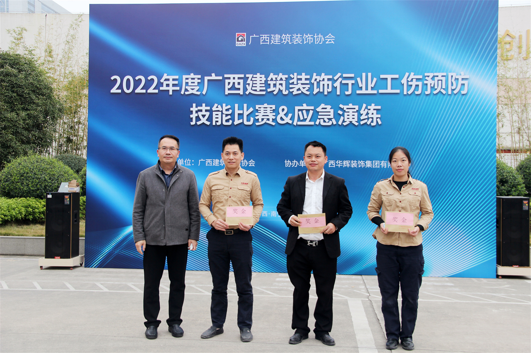 ▲广西建筑装饰协会会长 庞耀国(左一)为安全带技能竞赛第一名、灭火器使用技能竞赛第一名、心肺复苏技能竞赛第一名颁发奖金