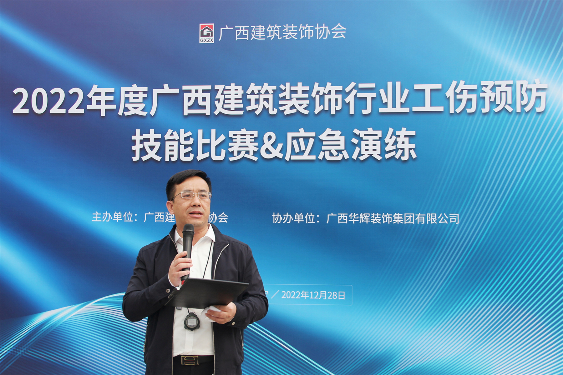 广西建筑装饰协会秘书长、工伤预防特聘讲师谭谦在致辞中表示希望通过举办本次技能比赛及应急演练,提升建筑装饰行业从业人员对特防用品的正确佩戴及使用情况,提高员工自救、救人能力,减少从业人员因突发危机情况而发生伤亡事故;并达到检验从业人员及义务消防应急组织应对火灾的能力,提高员工灭火、疏散、自救能力和管理者火场组织、协调、指挥能力的目的。