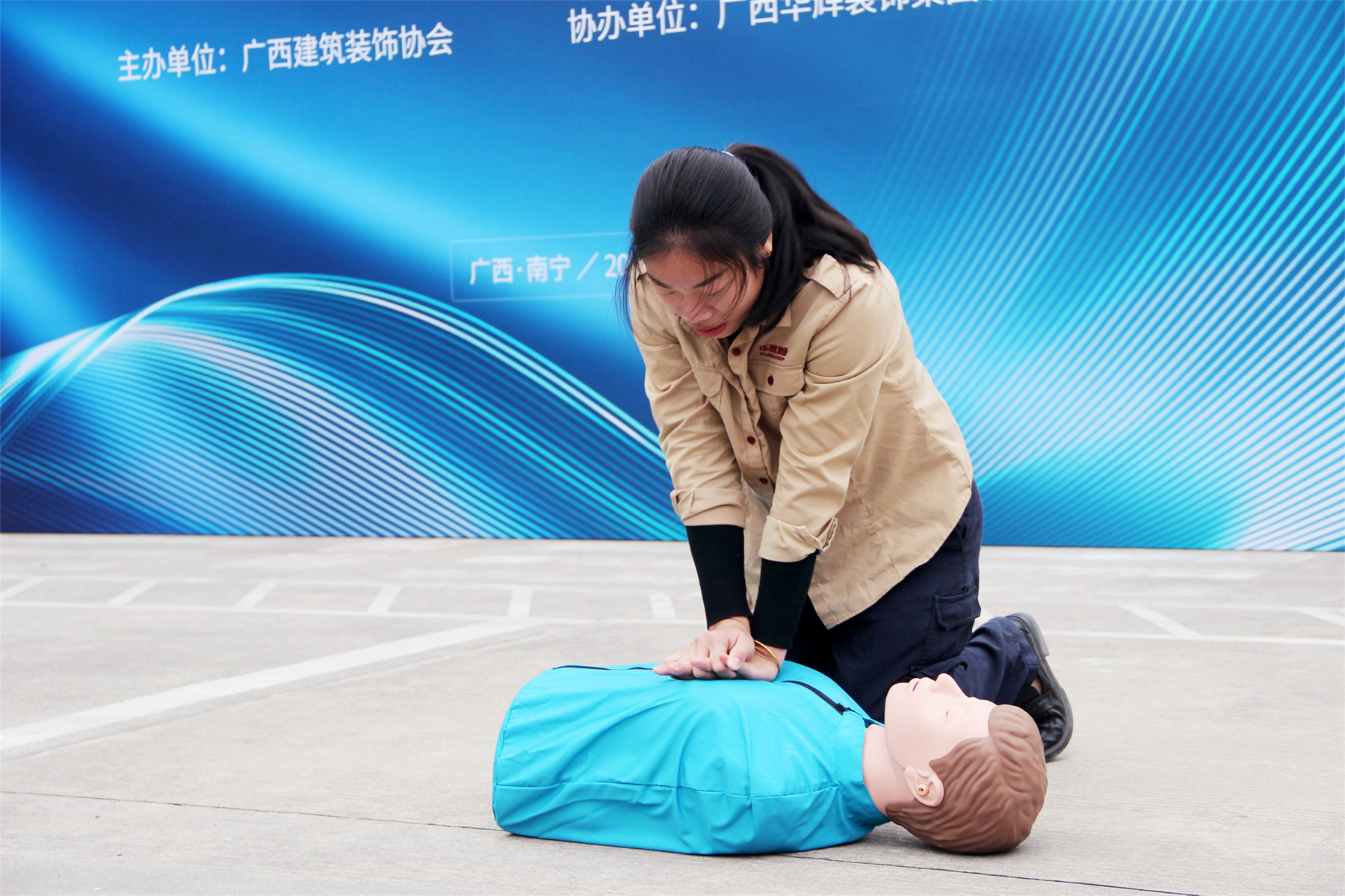 广西bsports必一体育装饰集团有限公司副总裁、协会工伤预防特聘讲师覃祖荣首先汇报本次活动的具体内容:一是应急演练,由疏散现场演练、现场灭火演练等两个环节组成;二是技能比赛,由安全带技能竞赛;灭火器使用技能竞赛;心肺复苏技能竞赛等三个环节组成。随后为参赛选手详细讲解了比赛规则及注意事项。
