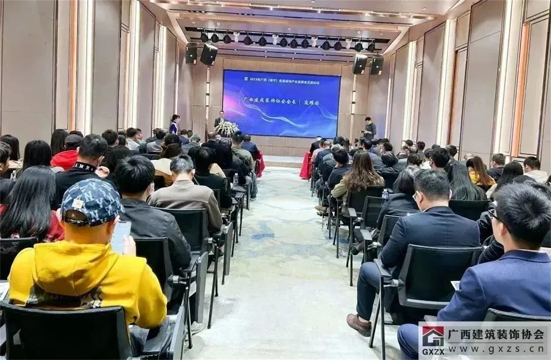 2023年2月27日,由广西建筑装饰协会主办的,2023年广西(南宁)家居装饰产业高质量发展论坛在南宁成功举办。广西消费者权益保护中心主任、广西消费者权益保护委员会秘书长唐楚尧、广西消费者权益保护中心(广西消费者权益保护委员会秘书处)消费指导与质量监督部主任李竞莹受邀出席活动。协会会长庞耀国、副会长杨景忠、谢嘉、秘书长谭谦、广西头部住宅装修企业负责人、来自协会约30家会员企业的代表等共100余人参加会议。