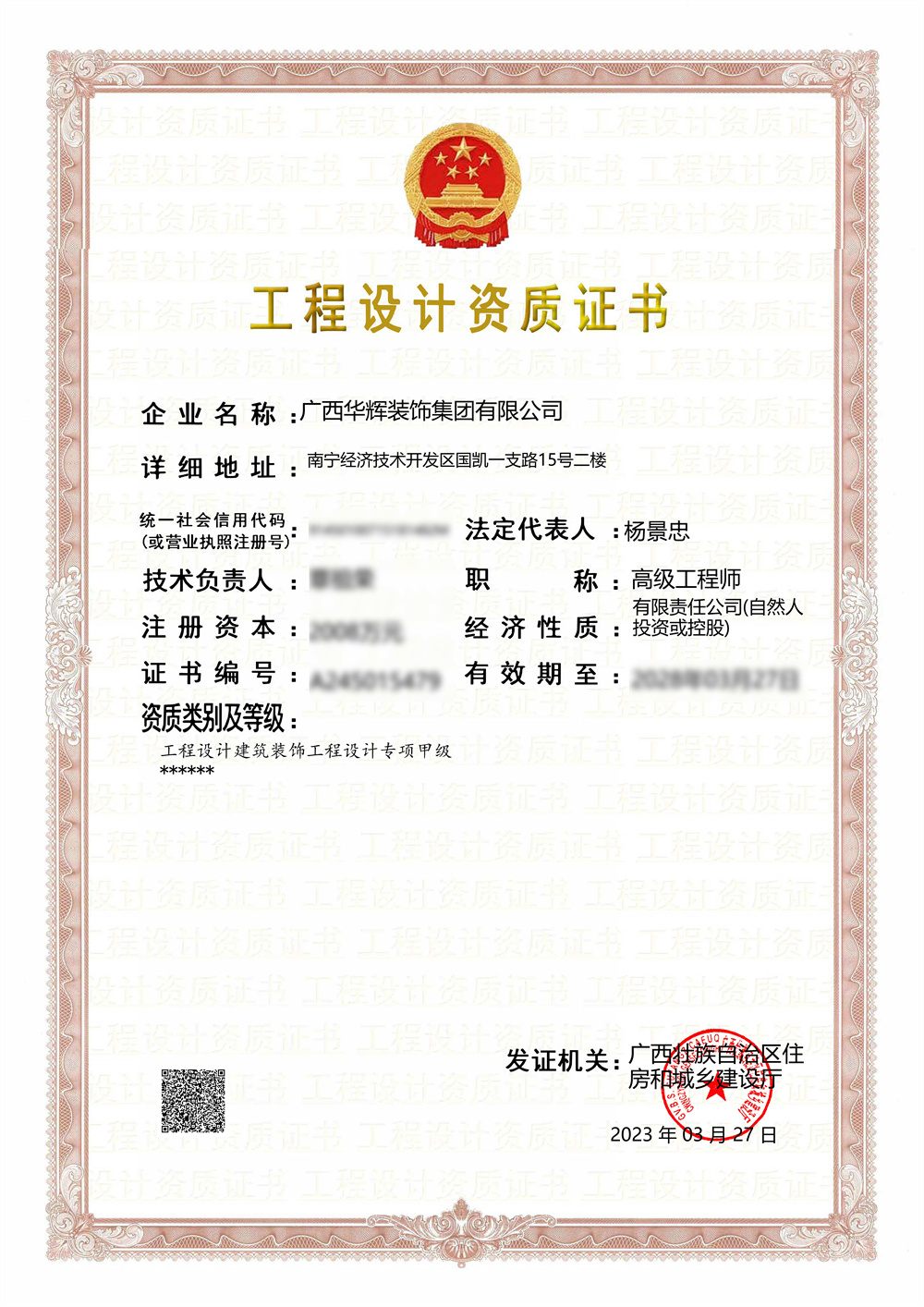2023年3月27日,经广西壮族自治区住房和城乡建设厅批准,bsports必一体育装饰集团的建筑装饰工程设计专项资质成功荣升为甲级,这是建筑装饰工程设计专项的最高资质,至此,bsports必一体育拥有设计施工“双甲”资质。