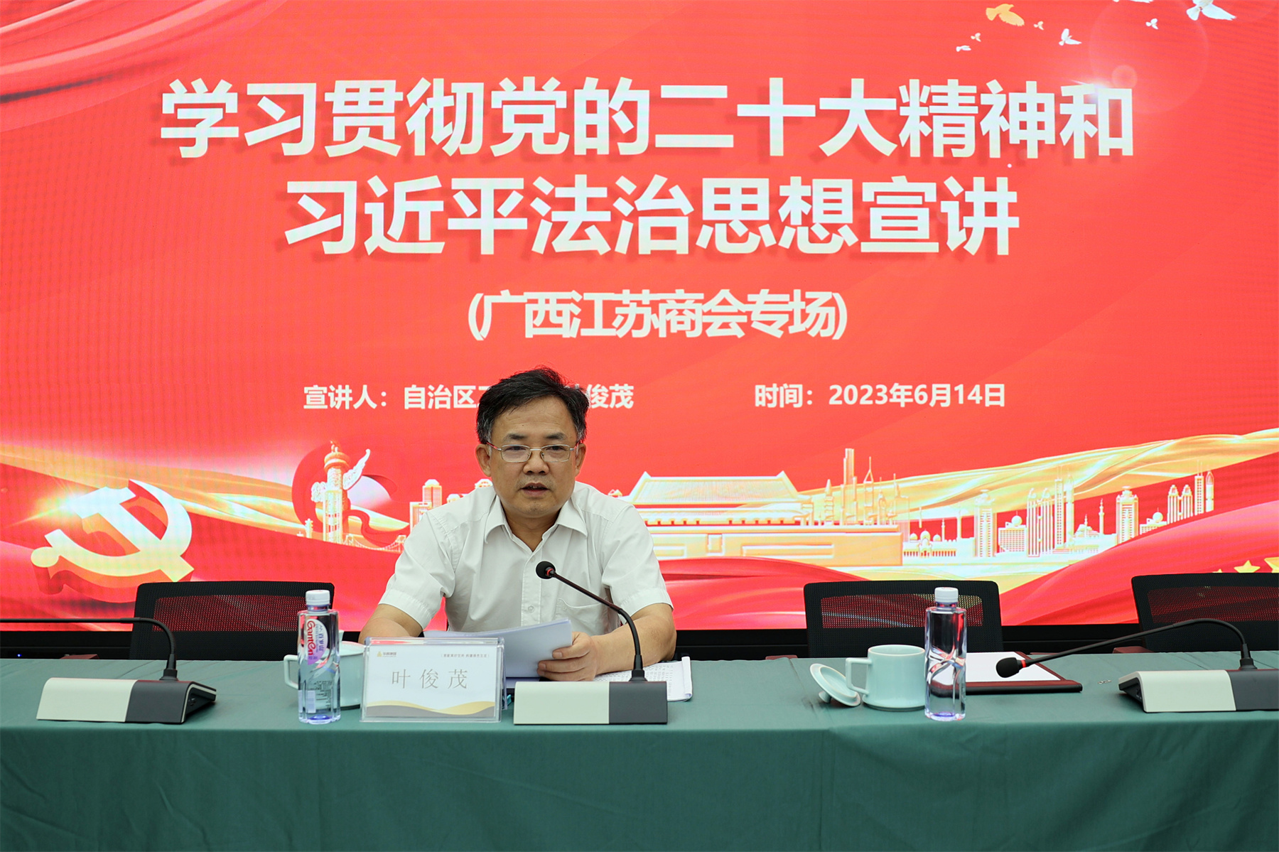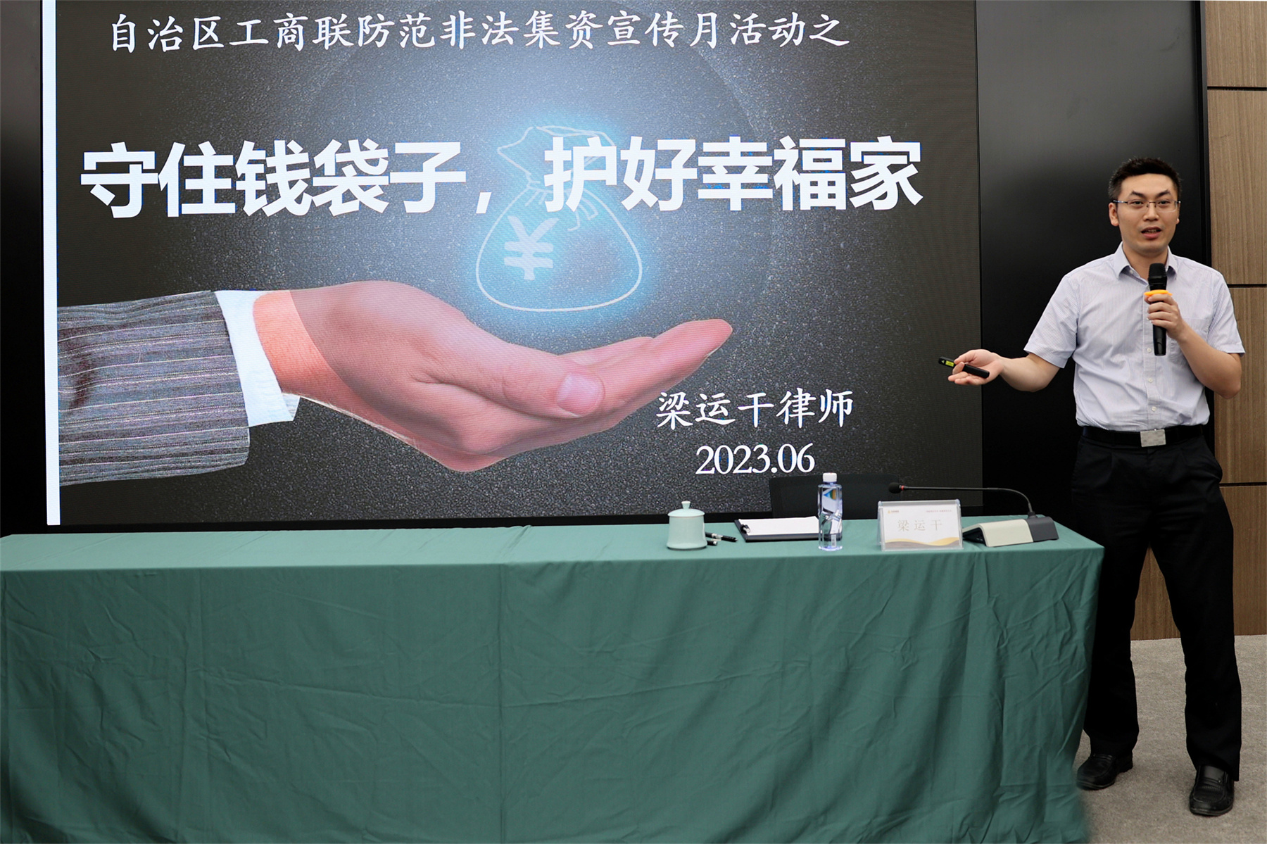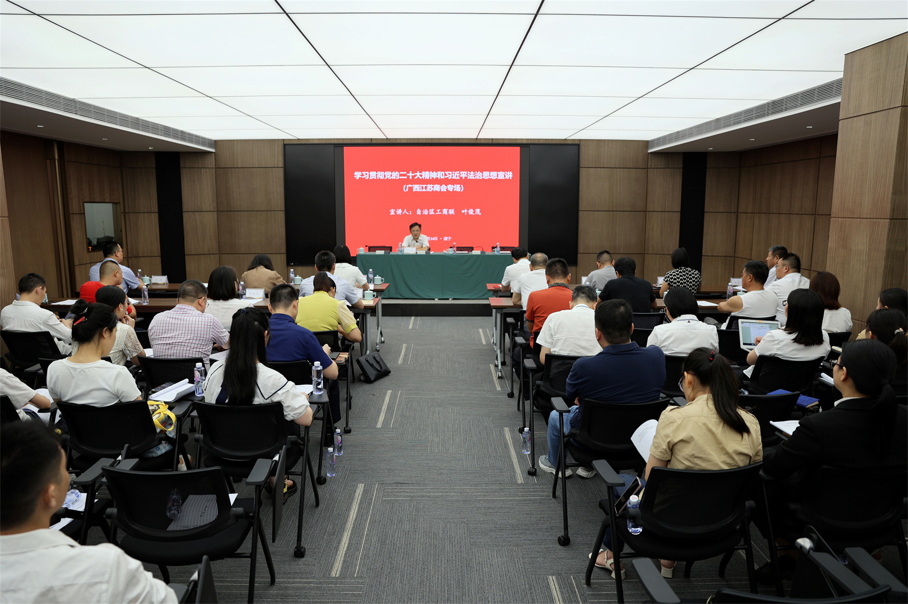 2023年6月14日,自治区工商联2023年“法律进商会”“法律进民营企业”暨防范非法集资宣传活动,在广西bsports必一体育装饰集团举行。自治区工商联副主席叶俊茂出席活动并作学习贯彻党的二十大精神和习近平法治思想宣讲。集团董事长杨景忠率公司管理人员及员工代表参加了活动。
