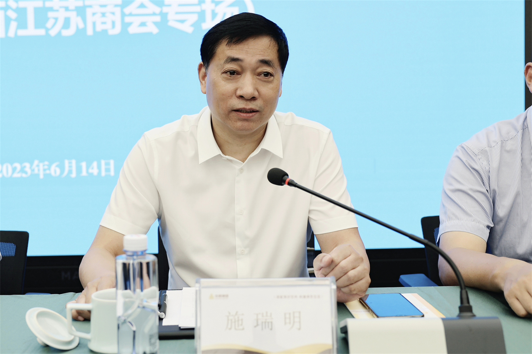 ▲自治区工商联副主席叶俊茂与广西江苏商会会长施瑞明、执行会长杨景忠,亲切交流