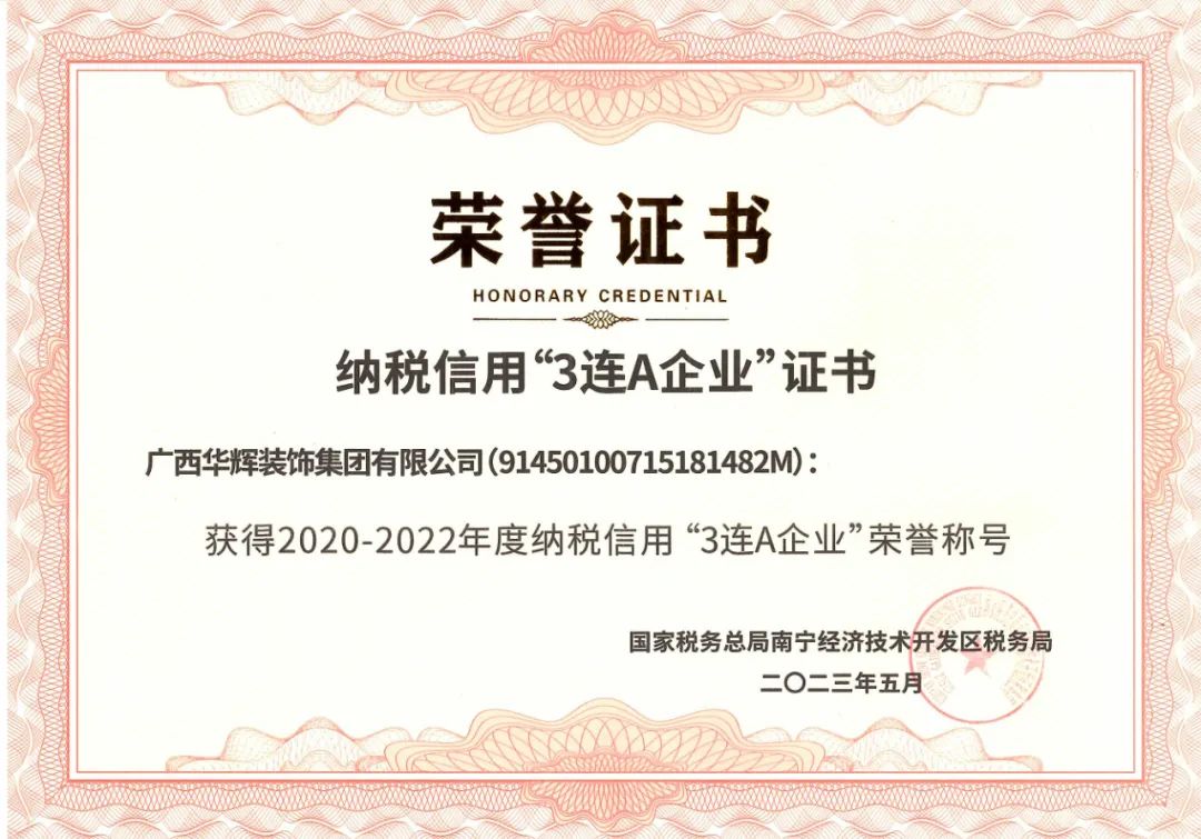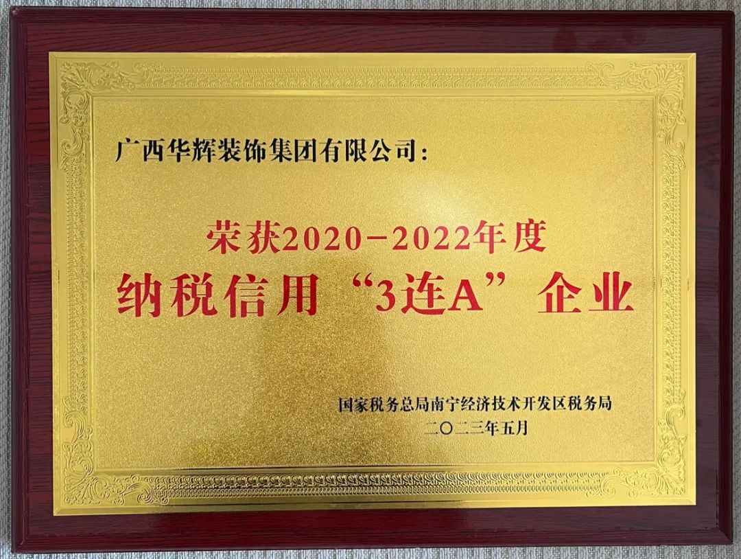 近日,广西bsports必一体育装饰集团凭借良好的纳税信誉,获得国家税务总局南宁经济技术开发区税务局2020-2022年度纳税信用“3连A企业”荣誉称号。