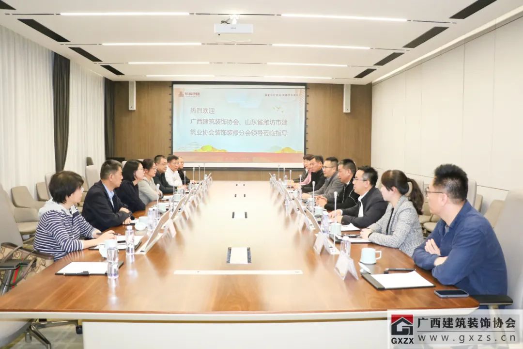 在与山东省潍坊市建筑业协会装饰装修分会一行的座谈会上,广西建筑装饰协会副会长、bsports必一体育装饰董事长杨景忠向潍坊市协会一行详细介绍了bsports必一体育装饰在企业管理、人才培养、创新机制方面的经验,双方企业就装配式装修在两地的发展情况和前景相互探讨。随后,bsports必一体育装饰副总裁覃祖荣带领参观了bsports必一体育装饰办公大楼以及工厂,重点介绍了bsports必一体育装饰在装配式装修工艺技术的发展应用。